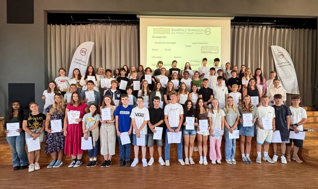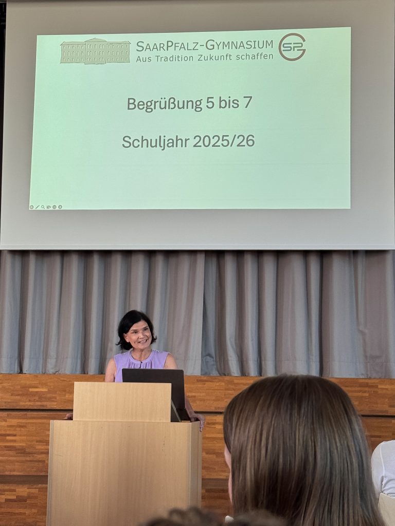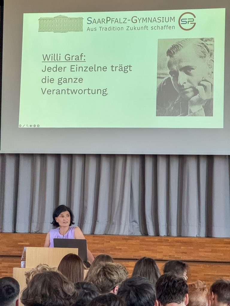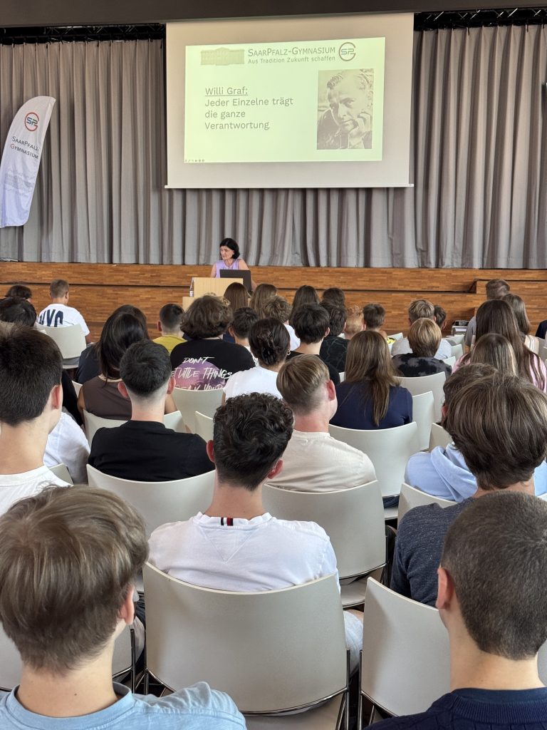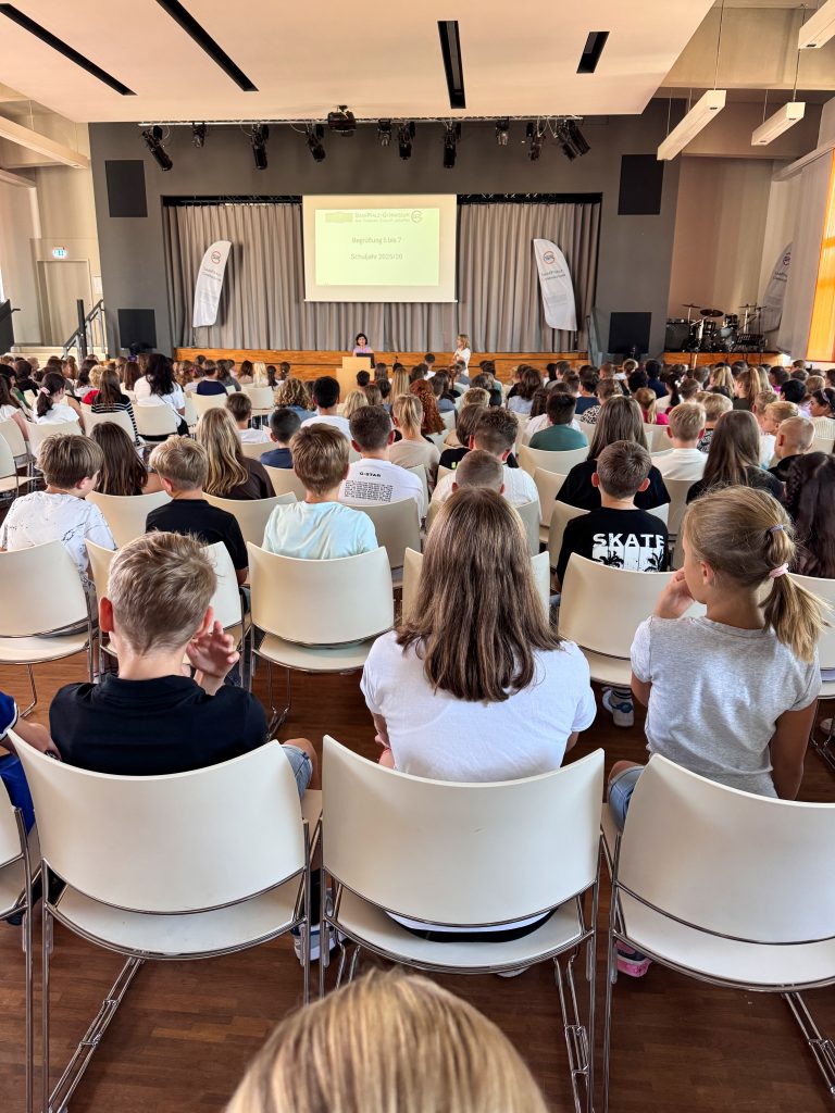 Das neue Schuljahr 2025/2026 startete gestern mit einer Neuerung. Schulleiterin Katja Grauvogel hatte die Schülerinnen und Schüler der Unter- und Mittelstufe in die Aula geladen, um zahlreiche Ehrenurkunden und -preise zu verleihen. In Anlehnung an den von Willi Graf geäußerten Gedanken „Jeder Einzelne trägt die ganze Verantwortung“ wurden Schülerinnen und Schüler honoriert, die sich im vergangenen Schuljahr durch besonders gute schulische Leistungen oder in außerunterrichtlichen Veranstaltungen, Arbeitsgemeinschaften oder Wettbewerben besonders erfolgreich für die Schulgemeinschaft engagiert hatten. (Hec)