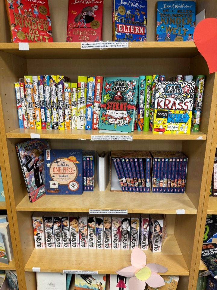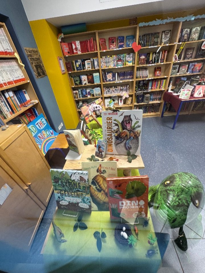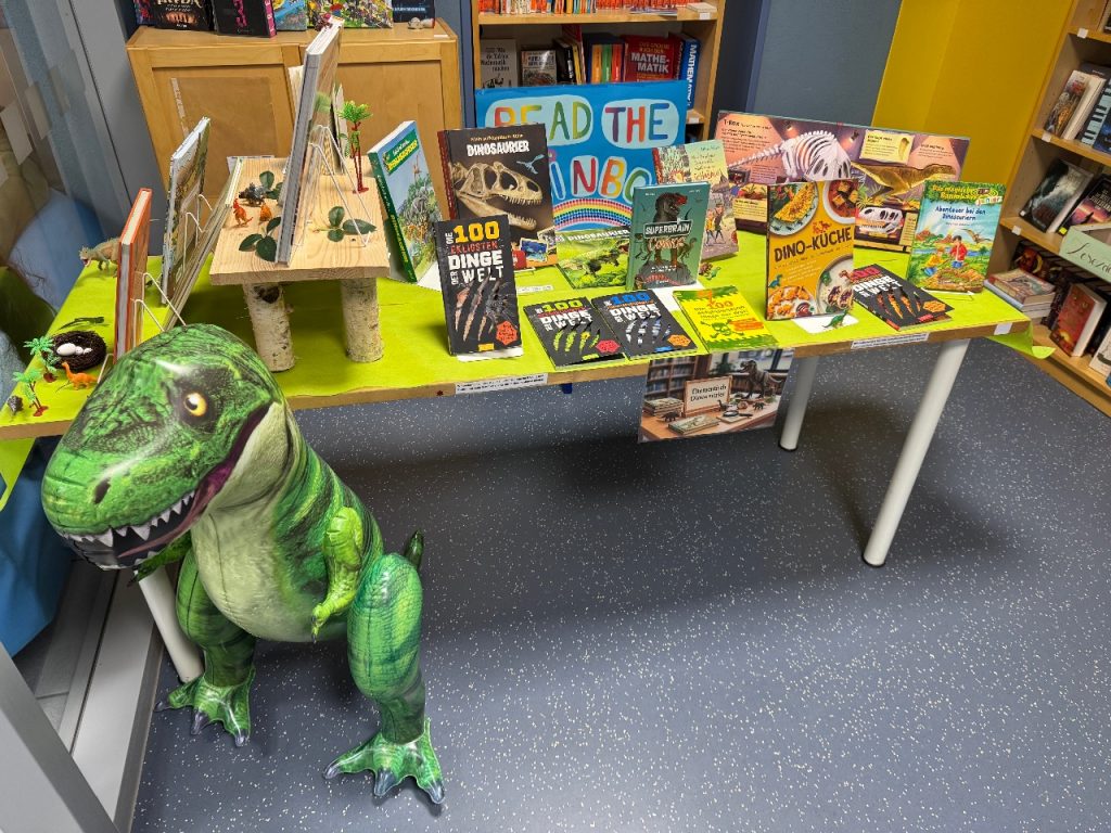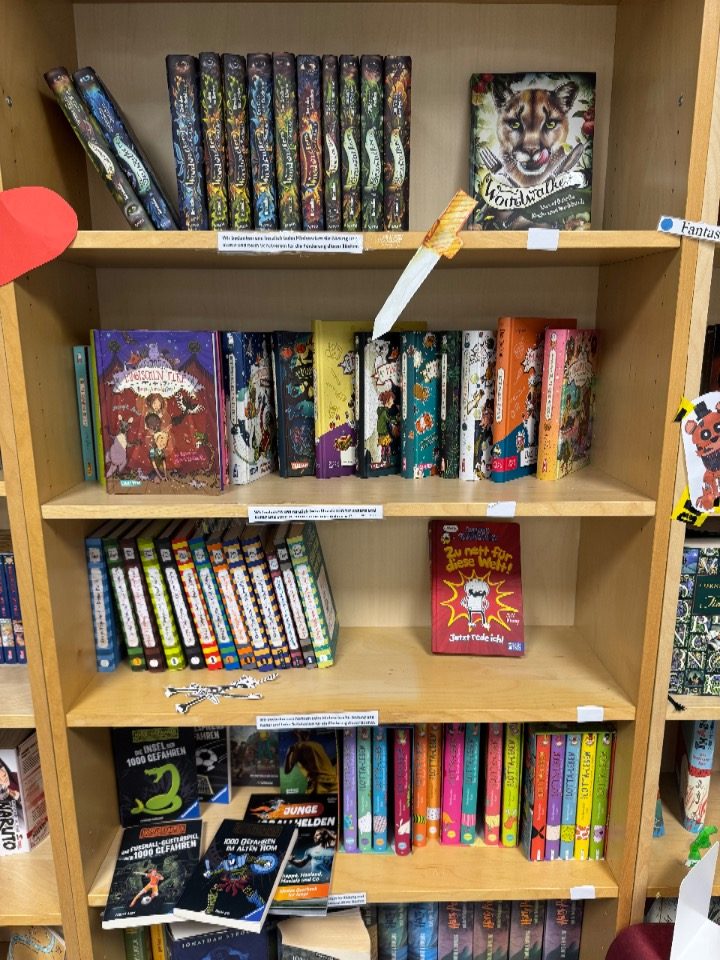 In unserer Schülerbibliothek gibt es viele neue tolle Bücher! Dank einer Förderung des Ministeriums für Bildung und Kultur und unseres Schulvereins konnten wir uns langgehegte Wünsche erfüllen und so gibt es nun viel Neues zu entdecken: zum Beispiel Gregs Tagebuch, Woodwalkers, Schule der magischen Tiere, Lotta-Leben, Tom Gates, One Piece und vieles mehr! Auch Fans von Kochbüchern kommen nicht zu kurz und zwei weitere Thementische, auf denen ihr alles zu Märchen und Dinosauriern entdecken könnt, ergänzen nun unser Angebot. Namensvorschläge für den Dino nehmen wir gerne entgegen!