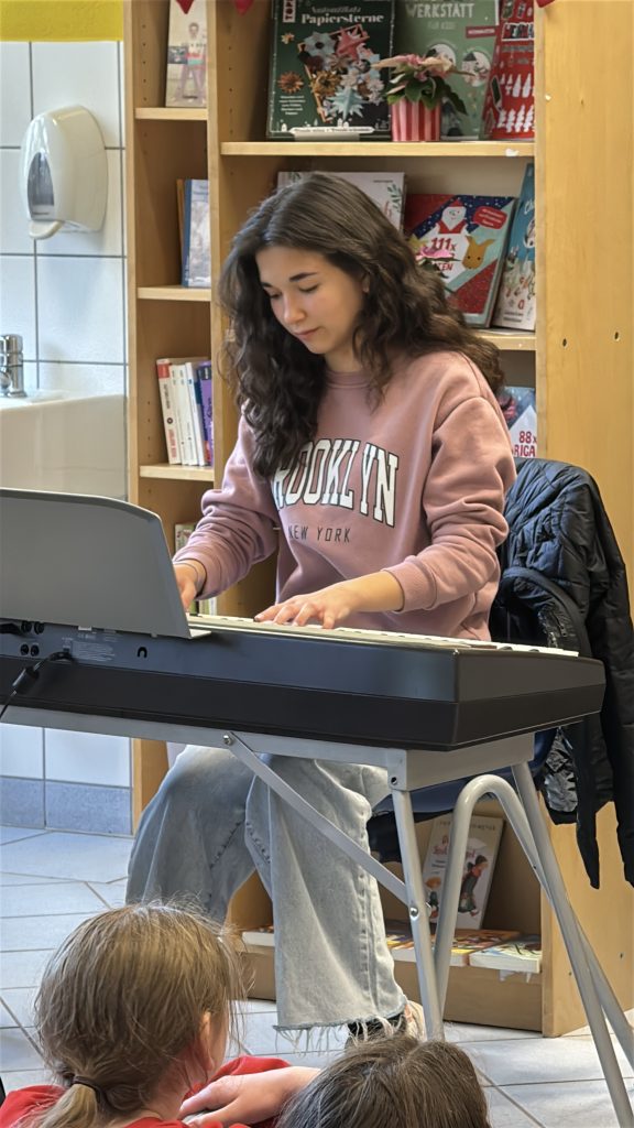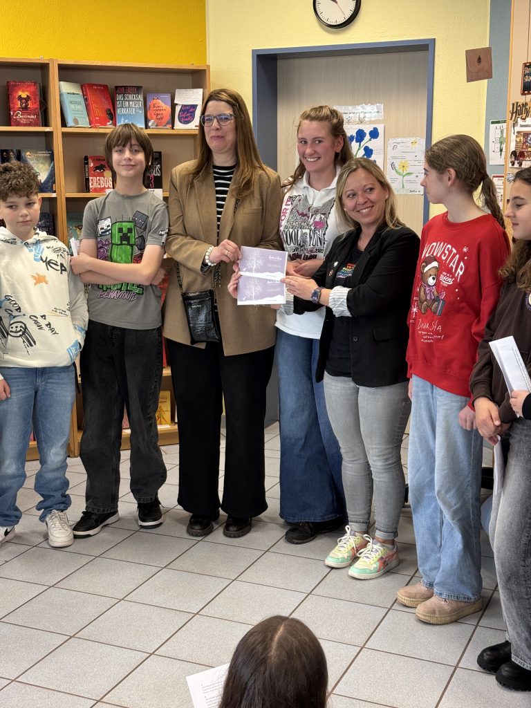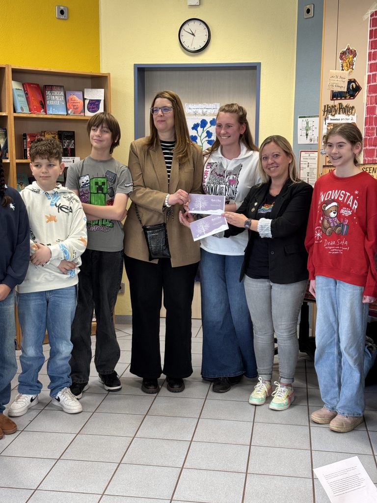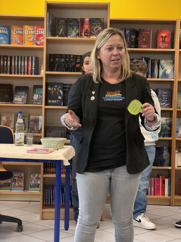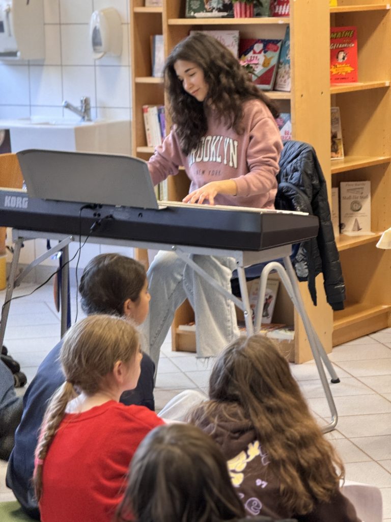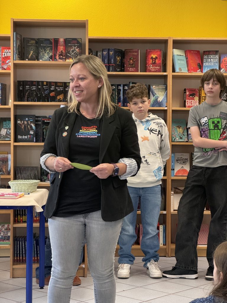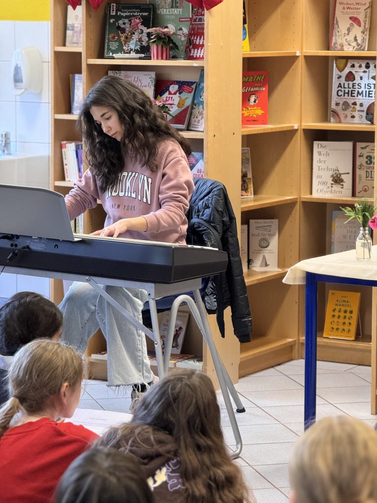 Musikalisch untermalt wurde die Veranstaltung von unserer Schülerin Esin Karatayli, Ava Dörr berichtete im Interview mit Frau Heide von ihrer Teilnahme am Vorlesewettbewerb, die sie bis zum Bundesentscheid nach Berlin führte, und die AG Schulbibliothek klebte gemeinsam mit Frau Heide die ersten Blätter an den „Lieblingsbücherbaum“, der mit den Buchtipps der Schulgemeinschaft wachsen soll.