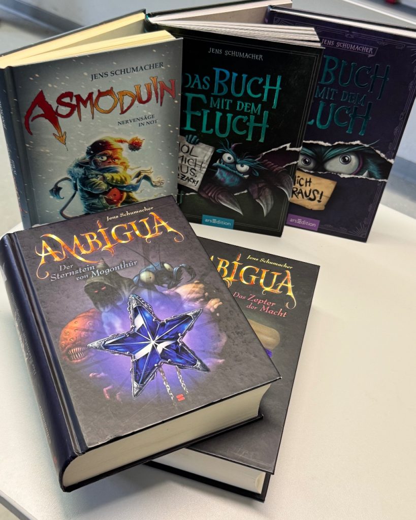 Er berichtete uns darüber, dass er schon seit längerem am Saarpfalz-Gymnasium seine Lesungen hält. Er selbst lernte schon früh lesen und schrieb ab der ersten Klasse kleine Geschichten, in denen es um Monster ging, die alle aufaßen und unter anderem überall hinmachten. Vor ca. 30 Jahren konnte man sein erstes Buch kaufen. In seiner bisherigen Karriere schrieb er ungefähr 150 Bücher und auch Spiele. Einige dieser vielfältigen und bunten Bücher hatte er auch dabei und stellte sie uns vor. Dabei handelte es sich besonders um die Buchreihe „Welt der 1000 Abenteuer“, bei der man selbst entscheiden darf, wie die Geschichte weitergeht. Er las aus dem Buch „Der Schatz der Oger“ vor, das auch zu dieser Buchreihe gehört. In unserem Fall haben wir in demokratisch in der Klasse abgestimmt, wie wir uns entscheiden. Wir durften uns auch ein Talent aussuchen, das uns bei der Handlung der Geschichte hilft. Unsere Wahl fiel auf Vorahnung.