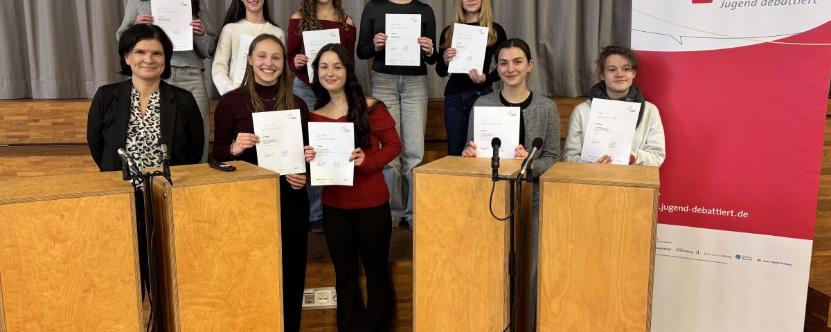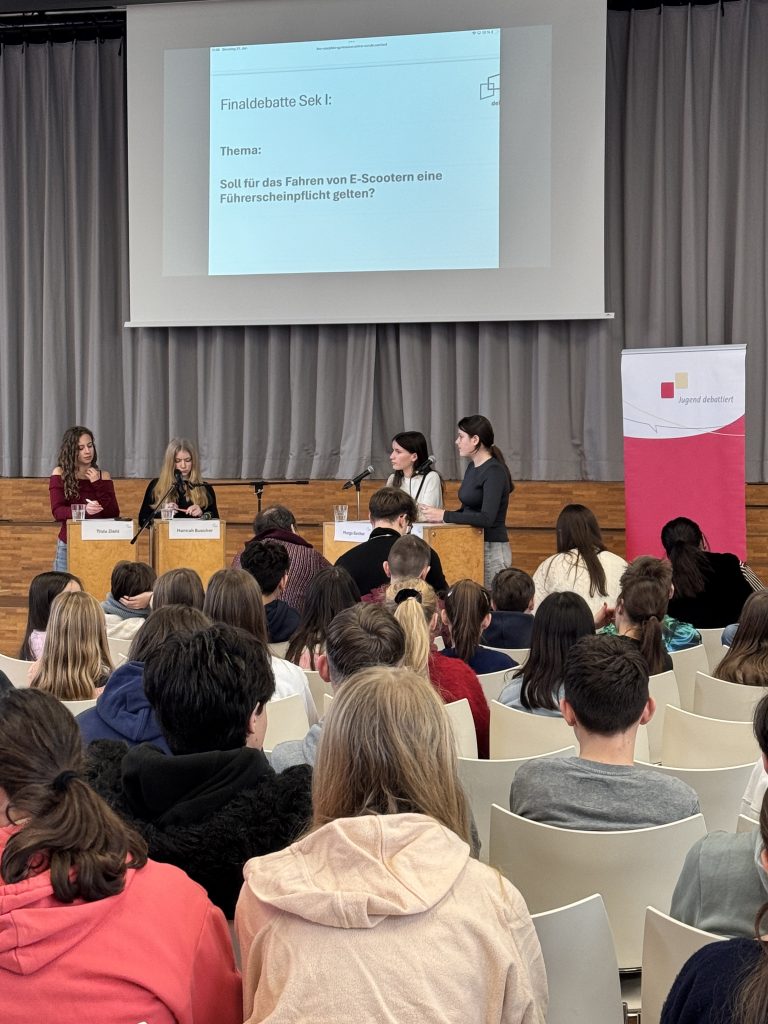 Zwei Jurys, die sich aus Mitgliedern des Deutschkollegiums und Schülerjurorinnen zusammensetzen, bewerteten die Debatten nach den Kriterien Sachkenntnis, Ausdrucksvermögen, Gesprächsfähigkeit und Überzeugungskraft. Bei den gelungenen und qualitativ hochwertigen Debatten war das für die Jurys keine leichte Aufgabe. Schlussendlich konnte sich in Altersstufe 1 Hannah Busch auf dem 1. Platz durchsetzen, gefolgt von Tilda Ziehl auf Platz 2. In Altersgruppe 2 gingen die ersten beiden Plätze an Clara Drumm und Ayla Sönmez. Herzliche Gratulation zu eurem Erfolg!